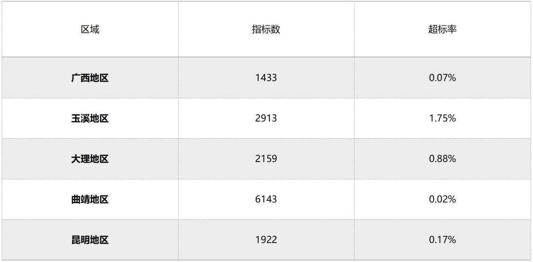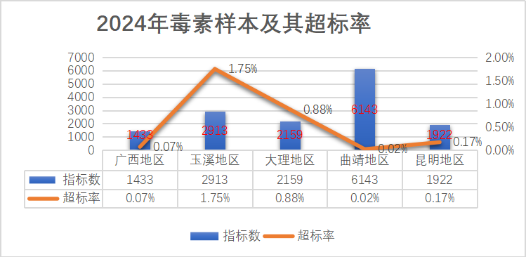 各地区霉菌毒素超标率广西地区达0.07%,玉溪地区达1.75%,大理地区达0.88%,曲靖地区达0.02%,昆明地区达0.17%,均为轻度污染。2024年以上5个地区接收的原料中曲靖受污染最小,玉溪地区受污染最大。