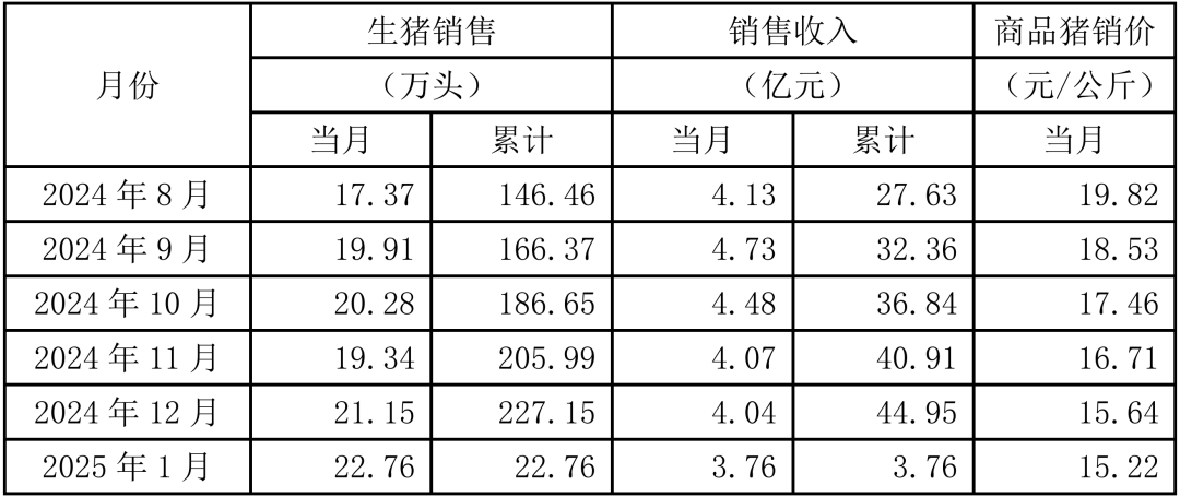 2025年1月份,公司销售生猪22.76万头(其中商品猪销售18.95万头,仔猪销售 3.49 万头),销售收入 3.76亿元。其中向集团内部屠宰企业销售生猪3.29万头。