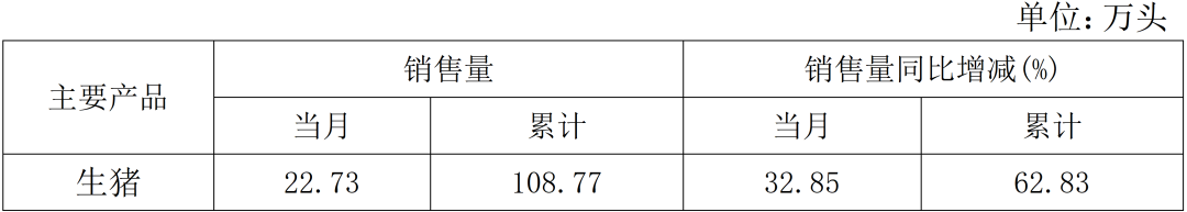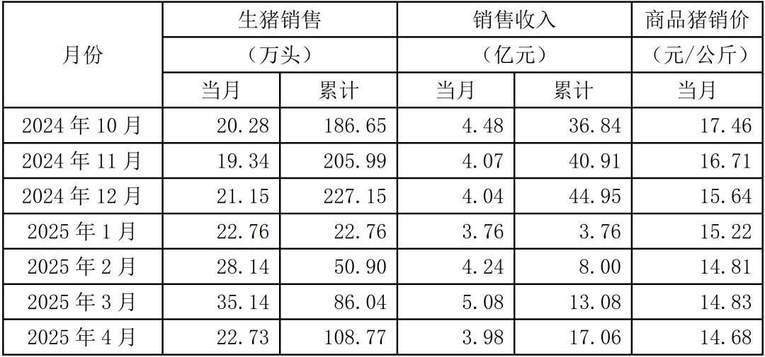 2025年4月份,公司销售生猪22.73万头(其中商品猪销售21.00万头,仔猪销售1.32万头),销售收入3.98亿元。其中向集团内部屠宰企业销售生猪3.29万头。