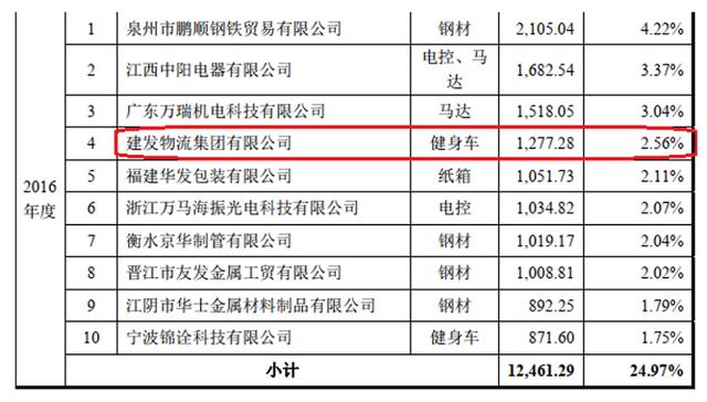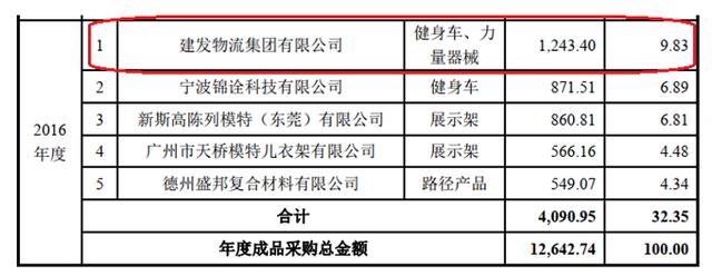 与此同时,招股说明书又在“主要成品采购供应情况”中显示,2016年,舒华体育向建发物流集团的采购内容为健身车和力量器械,采购金额为1243.4万元;