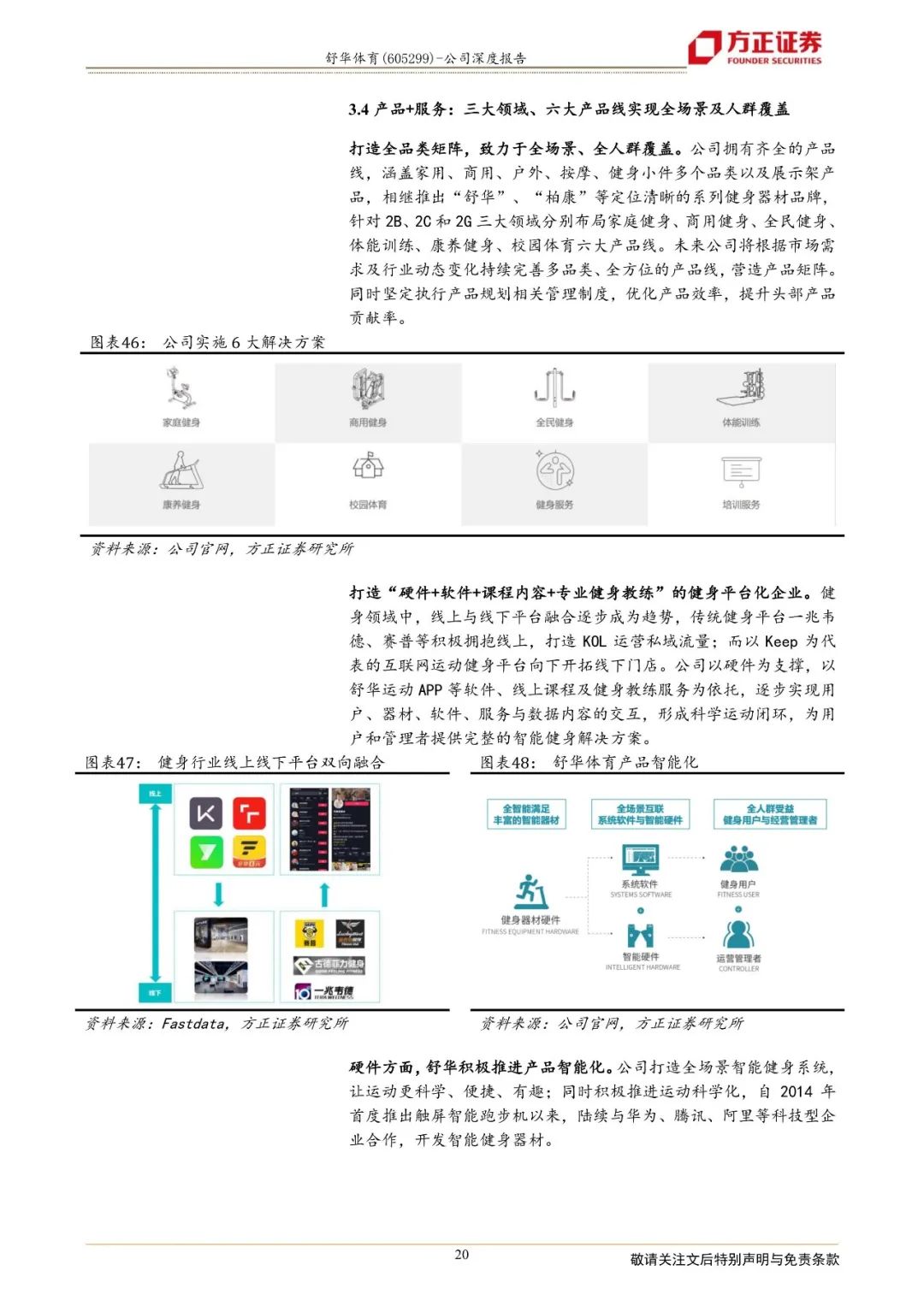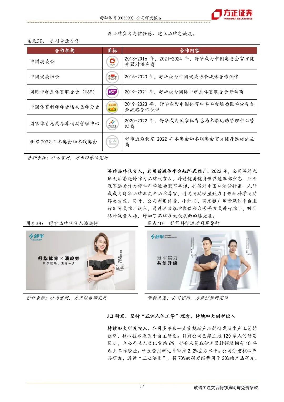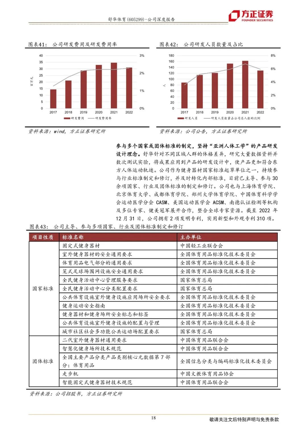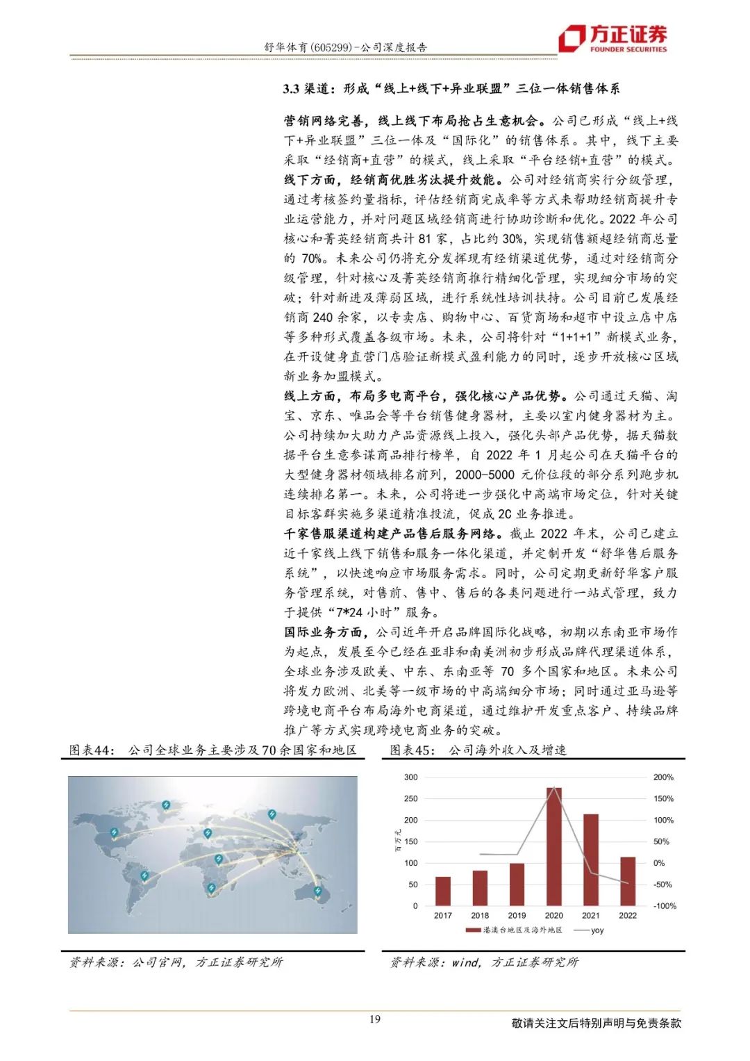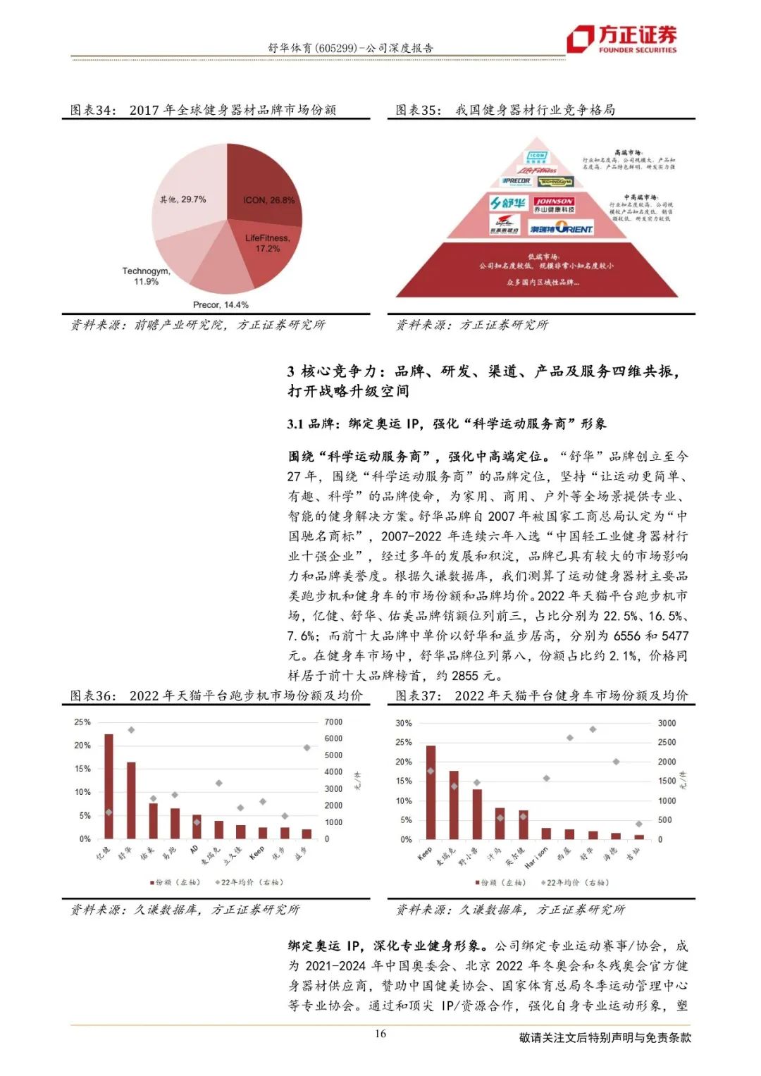 品牌、研发、渠道、产品及服务四维共振,打开战略升级空间:1)品牌:围绕“科学运动服务商”,强化中高端定位。通过绑定奥运、专业协会IP强化专业形象;运动明星代言+全渠道营销推广,提升大众品牌声量;2)研发:坚持“亚洲人体工学”理念,持续加大创新投入,参与多个国家或团体标准的制定;3)渠道:形成“线上+线下+异业联盟”三位一体销售体系,全球业务涉及70多个国家和地区;4)产品+服务:三大领域、六大产品线实现全场景及人群覆盖,携手华为推进产品智能化,推出舒华APP提升产品内容服务。