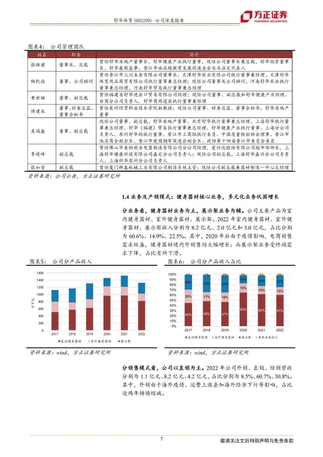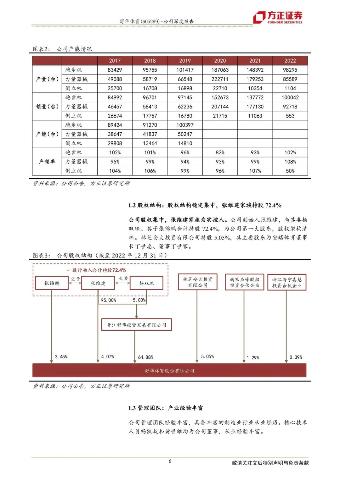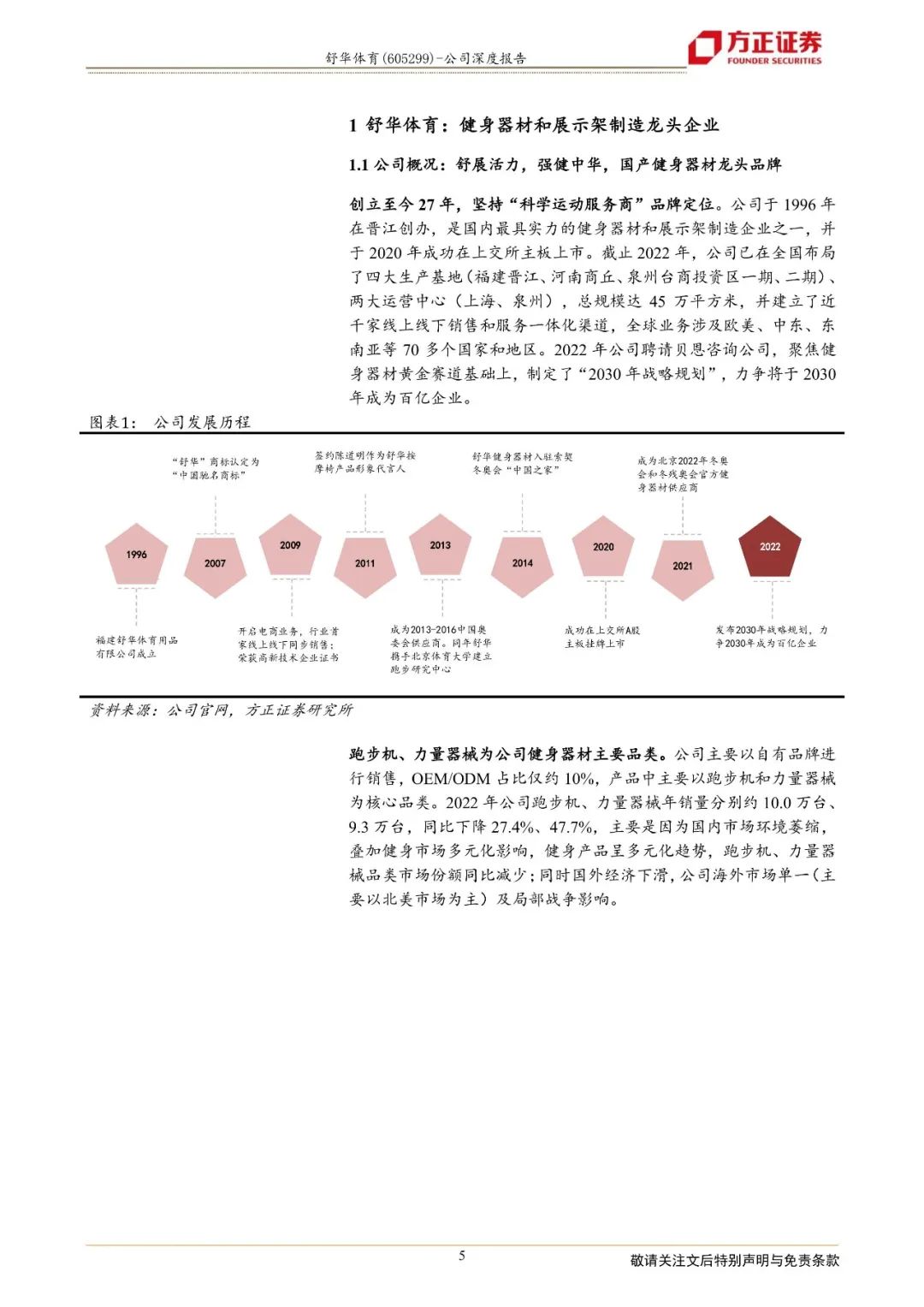 国产健身器材和展示架制造龙头企业:公司于1996年在晋江创办,是国内最具实力的健身器材和展示架制造企业之一,业务以健身器材、直营为主。公司现有四大生产基地和两大运营中心,2022年跑步机、力量器械年销量分别约10.0万台、9.3万台。2022年公司聘请贝恩咨询制定了“2030年战略规划”,力争将于2030年成为百亿企业。公司股权集中,创始人张氏家族合计持股72.4%。