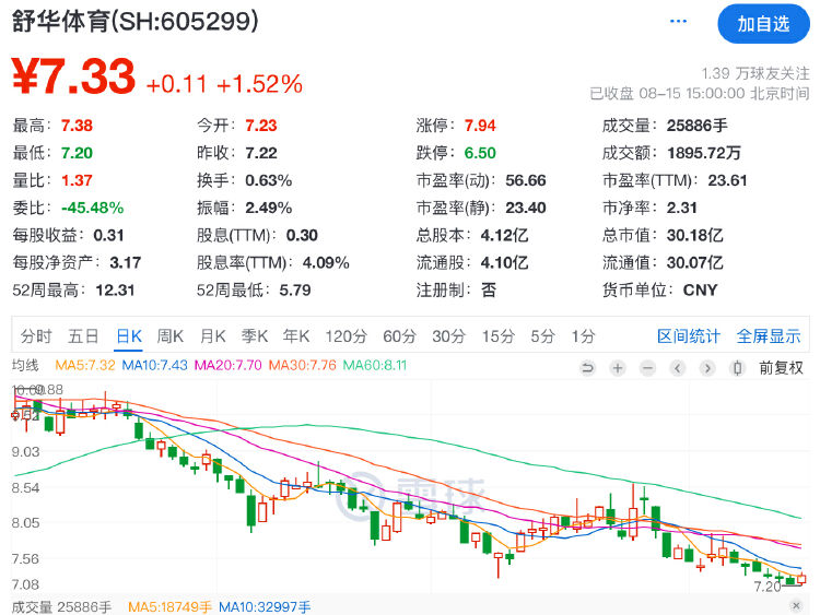截止8月15日收盘,舒华体育收涨1.52%,盘中一度跌至近日低点7.20元,收盘报7.33元。作为“奥运体育股”,舒华体育似乎没有得到巴黎奥运会的热度加成,近期股价仍是跌势。