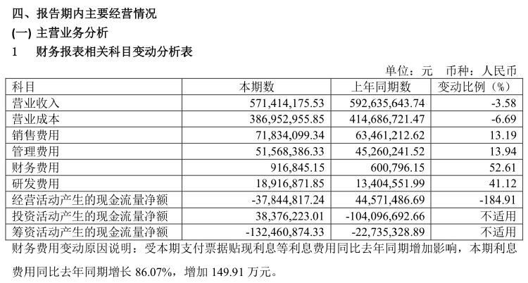 经营活动产生的现金流量净额同比去年同期下降184.91%,主要系由于(1)受本期部分供应商变更结算方式(由月结改为预付款等结算方式)及本期产量增加影响,本期购买商品、接受劳务支付的现金同比去年同期增长36.64%,增加10,769.71万元;(2)因新模式业务发展及海外市场拓展需要,本期销售人员增加,销售人员的工资费用亦随之增加,同时本期支付上年末工资费用同比去年同期增加,造成本期支付给职工以及为职工支付的现金同比去年同期增长28.23%,增加3,517.06万元。