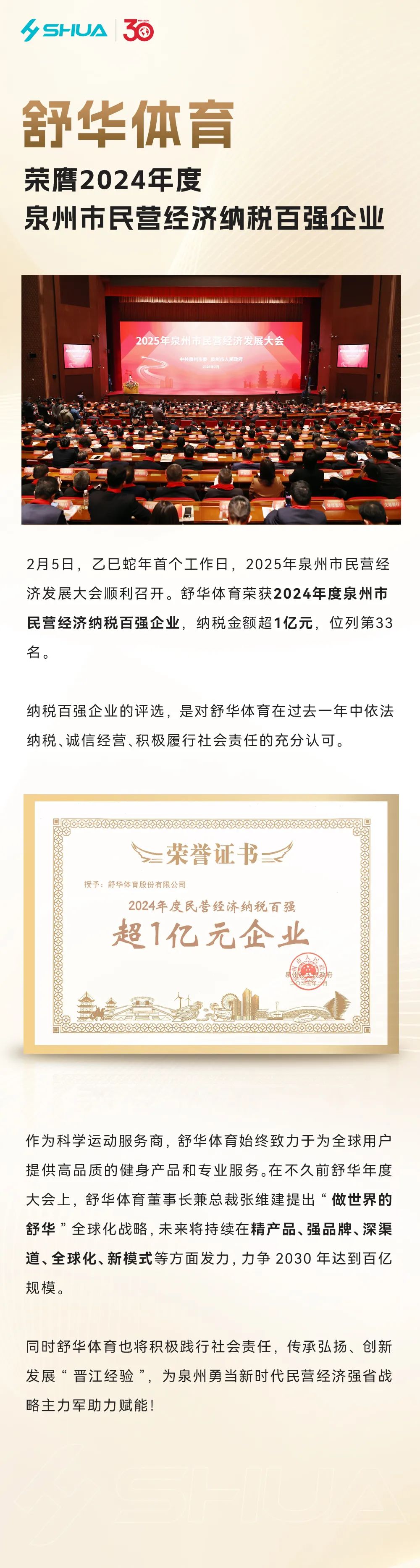 舒华体育荣膺2024年度泉州市民营经济纳税百强企业