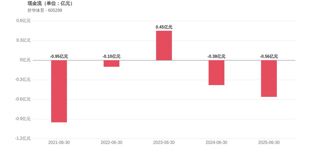 在经营稳健性方面,舒华体育面临运营效率下降的挑战,存货周转天数增至109.30天,较上年同期增长7.24%,表明库存管理压力加大。经营活动产生的现金流净额为-0.56亿元,连续两年同期为负,显示出公司在现金流管理方面存在困难。此外,2025年上半年的资产负债率为36.58%,同比增长2.53个百分点,这意味着公司债务负担有所加重。