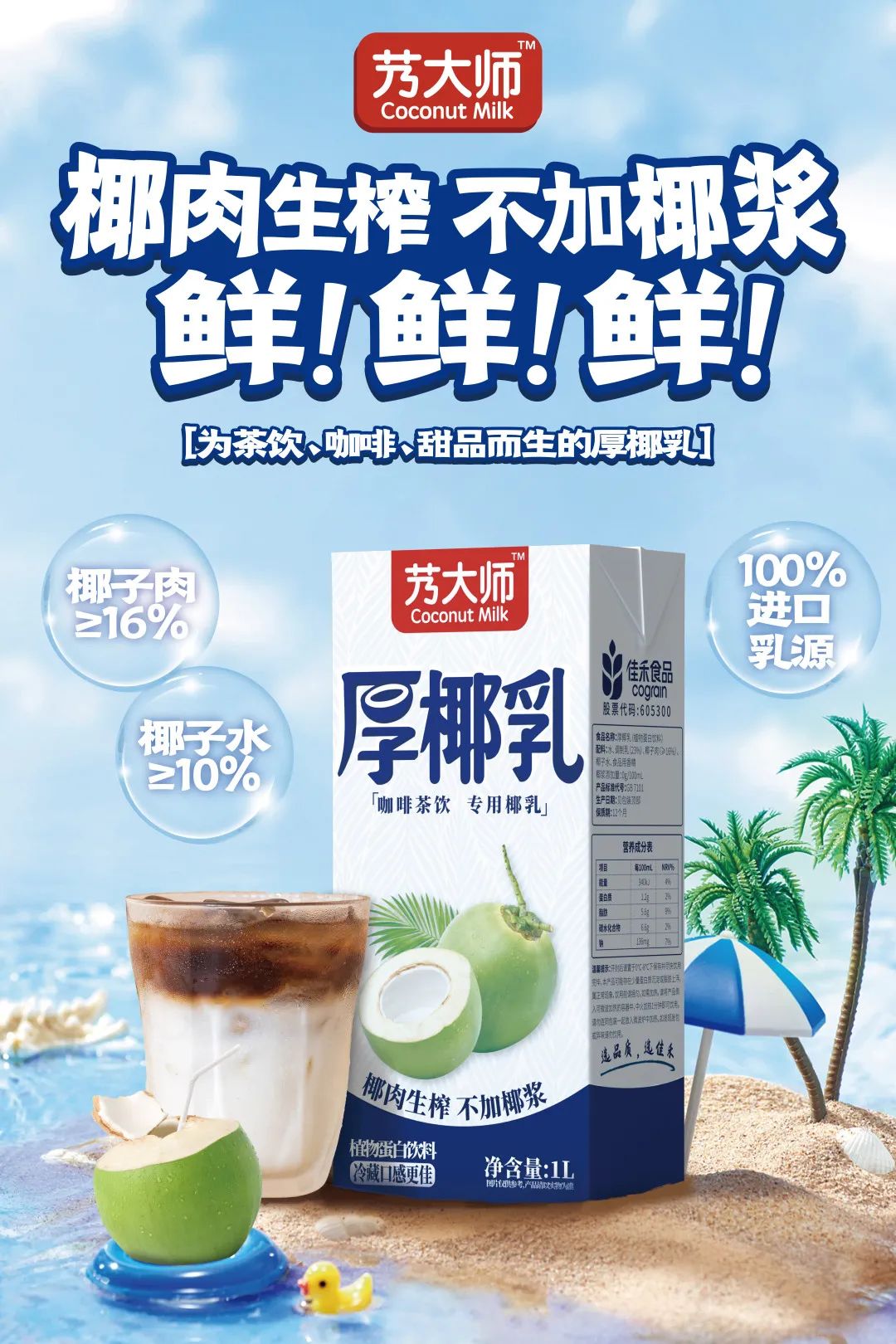 佳禾食品紧跟市场需求,推出的艿大师厚椰乳,采用椰肉生榨而成,不添加椰浆,椰香纯正、奶香自然、口感纯正。在应用场景方面,可调和咖啡、奶茶、水果等,也能与甜品、汤羹适配。