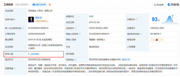 该项目实施主体为玛克食品(苏州)有限公司(下称玛克食品)。玛克食品成立于2014年,旗下参保人数却为零。佳禾食品称,该咖啡投建项目建设周期为24个月,项目内部收益率为14.03%,投资回收期长达7.60年。