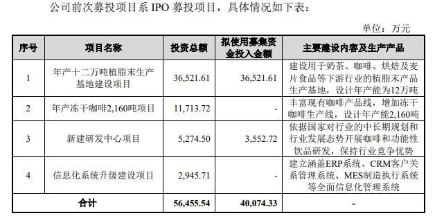 4亿元募资投向了年产十二万吨植脂末生产基地建设项目和新建研发中心项目,1.17亿元的冻干咖啡项目和约3000万元的信息化系统升级建设项目未使用IPO募资进行投资。