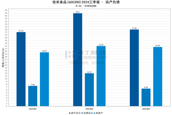 截至2024年第三季度末,佳禾食品的总资产为27.96亿元,相较于上年度末的32亿元减少了12.61%。负债合计从上年度末的9.54亿元减少至6.38亿元,资产负债率也从29.82%下降至22.8%。这表明公司在减少负债方面取得了一定进展,但总资产的减少可能反映了经营活动中的一些挑战。