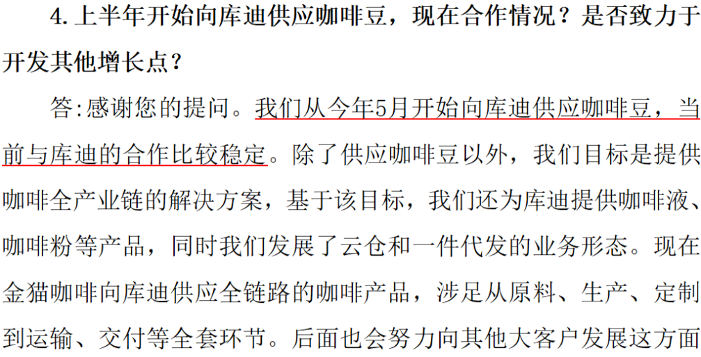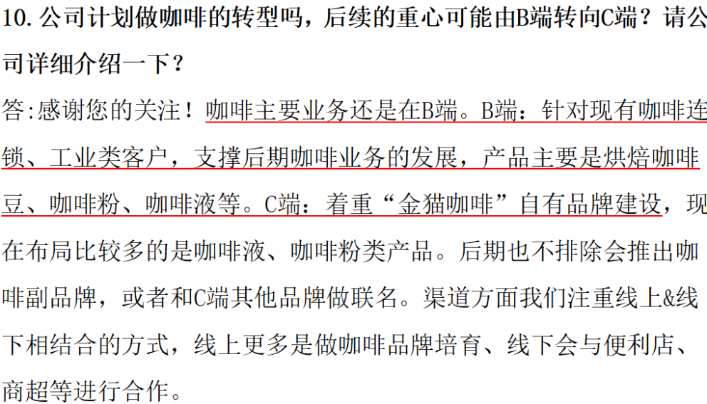 公司咖啡业务处于咖啡加工环节,主要面向B端,C端还在推进“金猫咖啡”的品牌建设。