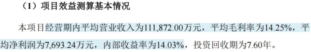 本项目预计2026年投产,参考公司的测算,预计经营期内平均营业收入为11.2亿元,约为2023年营收规模的40%。