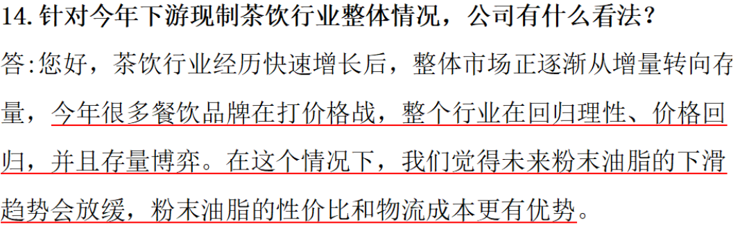 虽然公司表示粉末油脂的性价比和物流成本更有优势,未来粉末油脂的下滑趋势会放缓。
