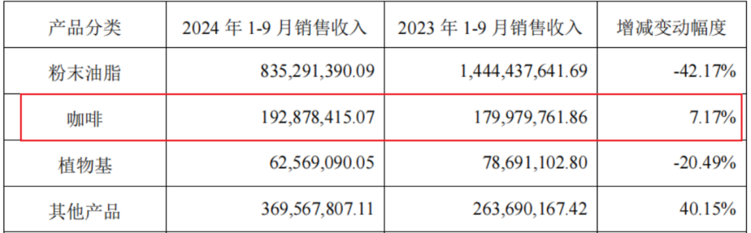 2024年前三季度,植脂末产品收入占比降至49.7%,咖啡、植物基、其他产品(其他固体饮料等)收入占比分别为11.5%、3.7%、22%。