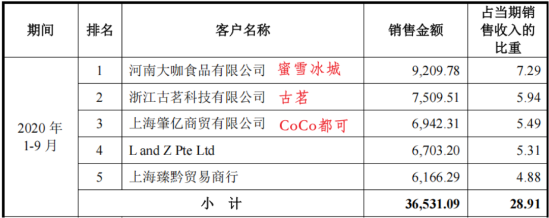 2020年1-9月,蜜雪冰城、古茗、CoCo都可分别位列前三大客户。