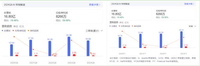 值得关注的是,从佳禾食品2024年三季报推测,其或在2024年全年营收、利润双降,且降幅明显。2024年前三季度,佳禾食品营收为16.8亿元,同比下滑19.46%;归母净利润0.83亿元,同比下滑59.88%,已几乎是佳禾食品近几年最大跌幅。