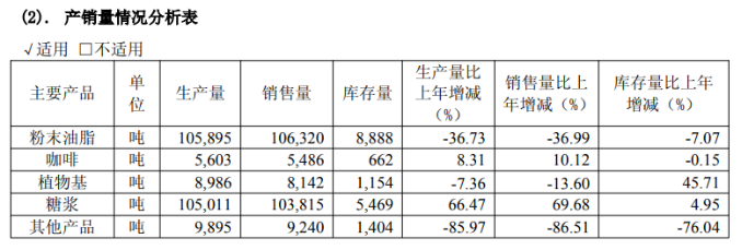 在此背景下,植脂末茶饮的市场份额受到挤压。2024年,佳禾食品粉末油脂的销量和生产量分别同比下滑36.99%和36.73%,实现收入同比下滑39.82%至11.59亿元。对于全年营收下滑,公司解释称,主要为宏观市场环境影响致使植脂末需求萎缩、餐饮行业价格战及客户自建产能等。