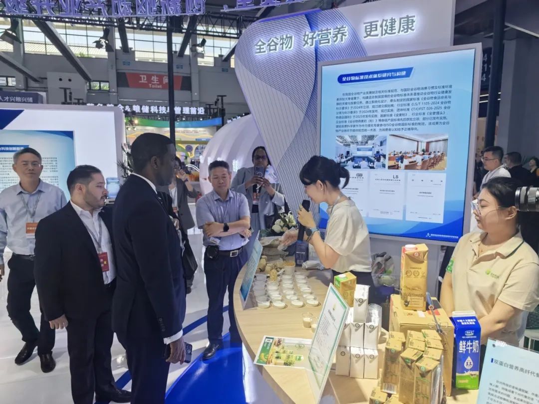 在这场聚焦粮食安全与产业发展的盛事中,佳禾食品联合国家粮食和物资储备局科学研究院(国粮院),在研究院展区设立“全谷物营养健康食品主题展区”,双方共同研发的全国首款全谷物燕麦奶作为核心创新产品惊艳亮相,工作人员现场为观众深入普及全谷物健康知识,成为全场焦点。