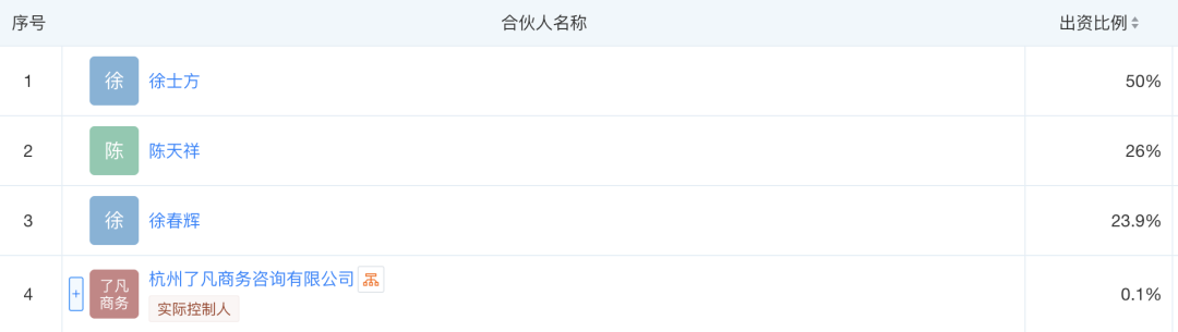 璟辉咨询是今年3月刚成立的公司,有徐士方、陈天祥、徐春辉等3位主要合伙人。股东杭州了凡商务咨询,也是同期成立的公司,由徐春辉个人独资。