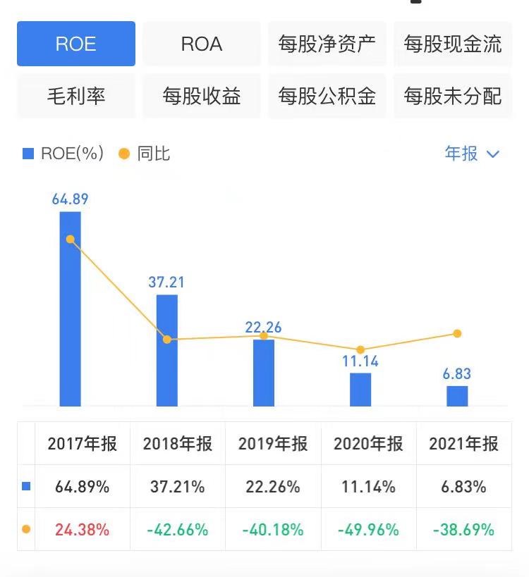 2017年-2021年,法狮龙ROE分别为64.89%、37.21%、22.26%、11.14%、6.83%,连续4年下滑。法狮龙称,2021年ROE下滑主要因员工持股计划,公司回购部分股份,净资产增加所致。