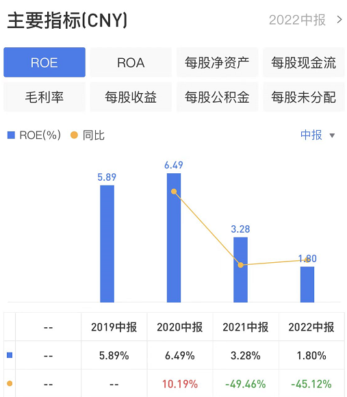 从净资产收益率(ROE)来看,2019上半年-2022年上半年,法狮龙ROE分别为5.89%、6.49%、3.28%、1.8%。