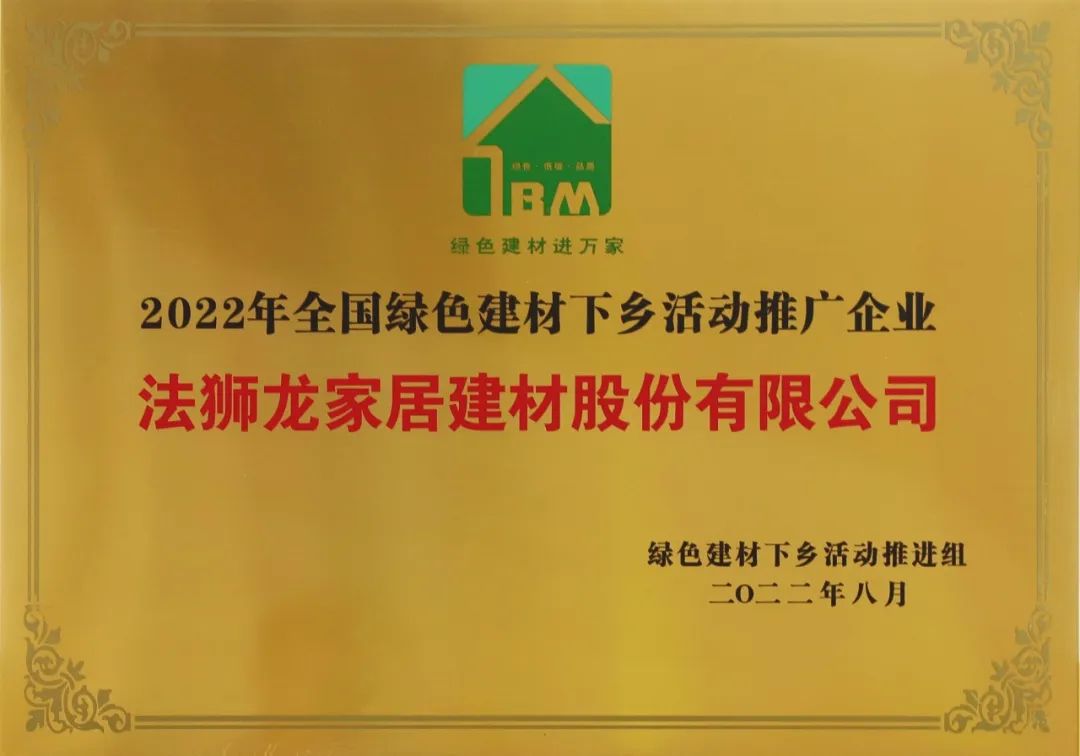 此次获得“2022年全国绿色建材下乡活动推广企业”,是行业对法狮龙绿色建材的认可,推动法狮龙在绿色健康建材产业链中快速发展。