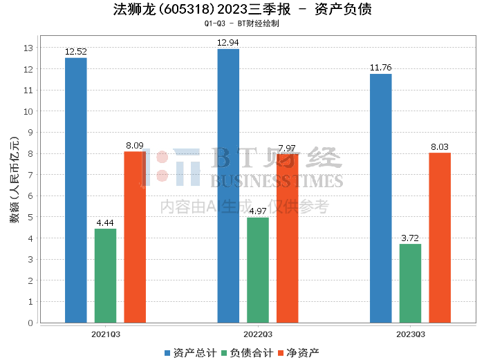 在资产负债方面,法狮龙2023年三季报显示,截至本报告期末,公司总资产为11.76亿元,相较于上年度末的12.05亿元,呈现出2.47%的小幅下降。负债合计为3.72亿元,较上年度末的4.21亿元下降了11.64%,净资产达到了8.03亿元,较上年度末的7.84亿元增长了2.43%。资产负债率从上年度末的34.95%降至31.69%,显示出公司的财务结构进一步优化。