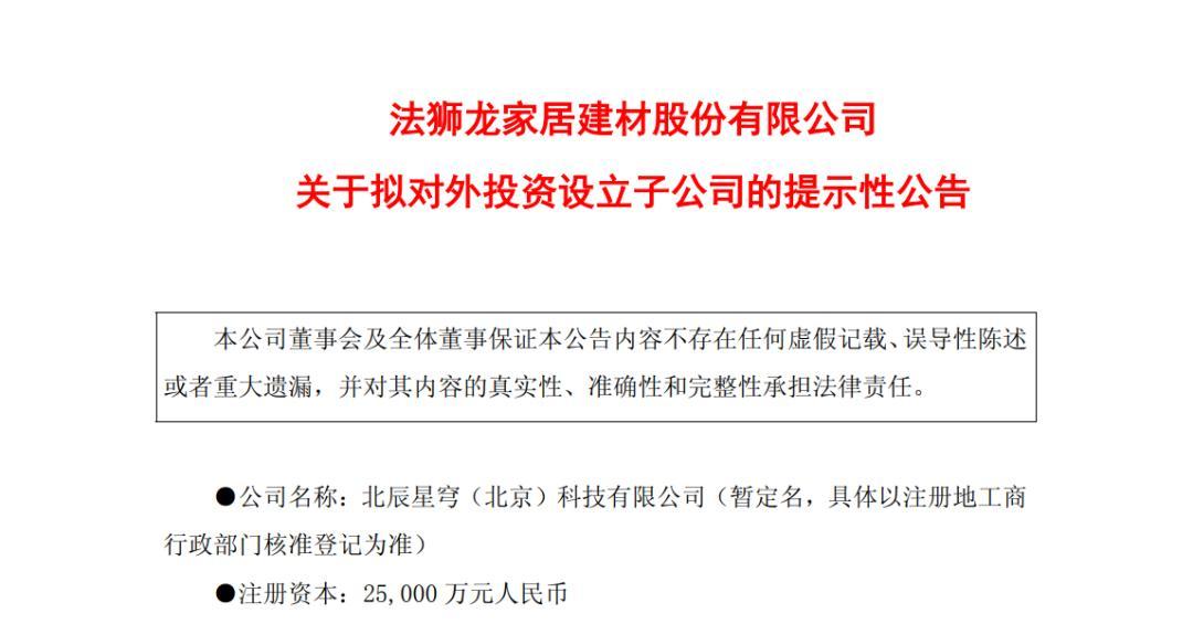 9月29日,法狮龙发布公告称,公司拟以自有及自筹资金出资2.5亿元设立全资子公司北辰星穹(北京)科技有限公司,正式布局人工智能、大数据、云计算等新兴科技领域。