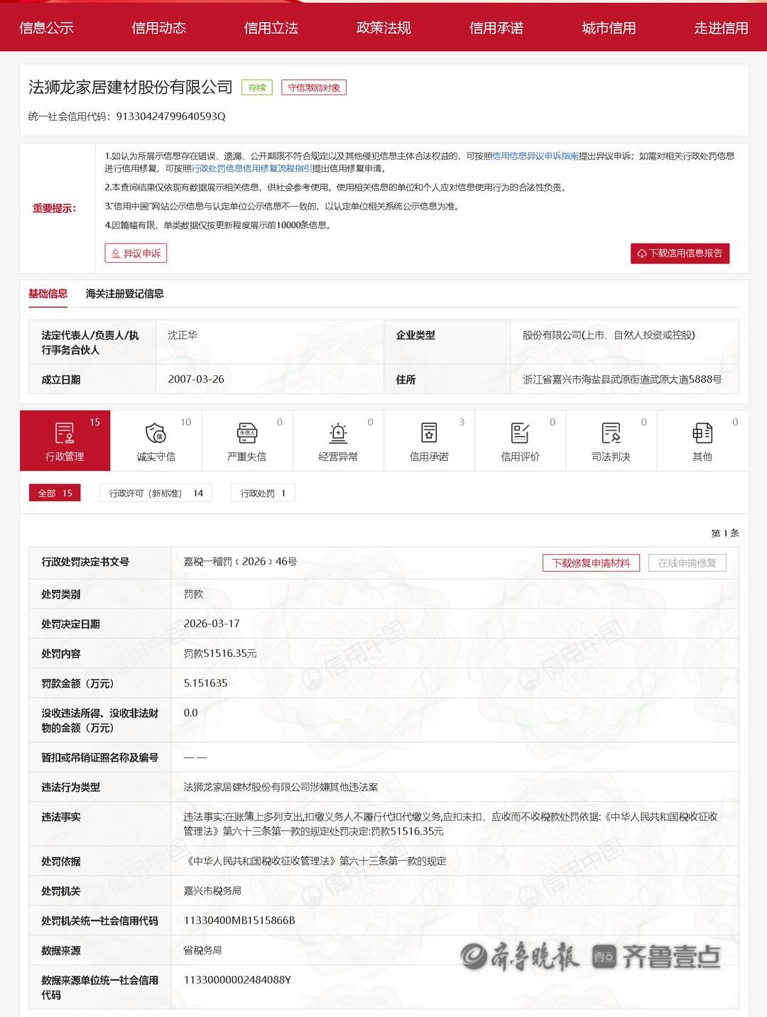 近日,齐鲁晚报·齐鲁壹点记者从信用中国获悉,法狮龙(605318)因在账簿上多列支出,扣缴义务人不履行代扣代缴义务,应扣未扣、应收而不收税款的行为,被嘉兴市税务局罚款51516.35元。
