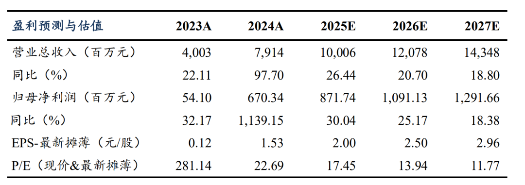 我们维持2025-2027年营业收入为100/121/143亿元,同比分别+26%/+21%/19%,基本维持公司2025-2027年归母净利润预测为8.7/10.9/12.9亿元,同比分别+30%/+25%/+18%,对应PE分别为17/14/12倍,维持“买入”评级。