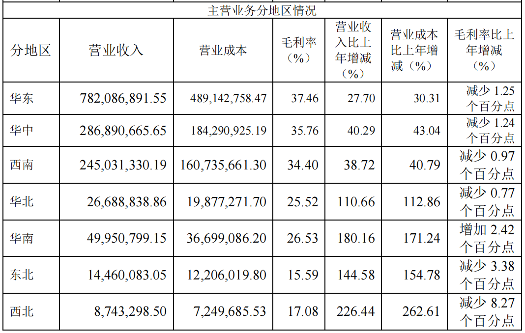 从区域来看,李子园销售前三的华东地区、华中地区、西南地区,销售占比分别为53.39%、19.59%、16.73%。李子园在公告中表述,前述地区是我国经济较为发达或人口较为密集的省份,市场仍有较大的开拓深挖空间。同时,公司在华北、华南、西北、东北地区进一步拓展市场,为全国性布局提供发展动力。