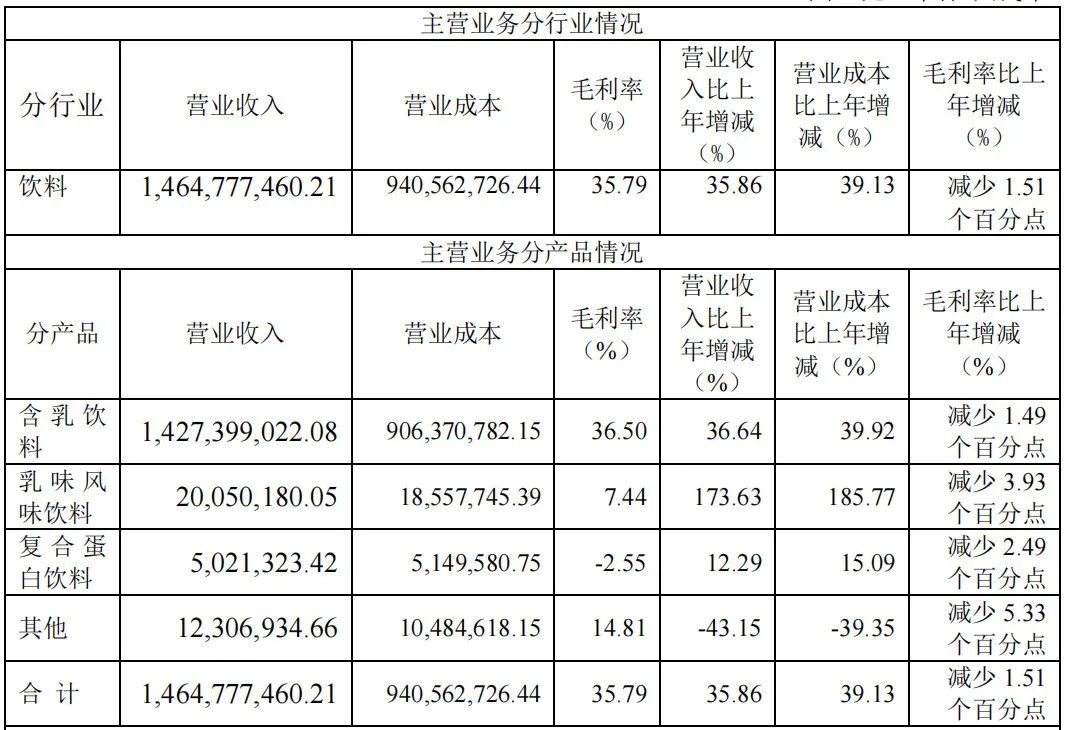 从年报数据可以看出,2021年,李子园主营业务收入主要还是来自含乳饮料,占营业收入比例为97.45%,其他饮料产品收入占营业收入比例为2.55%。