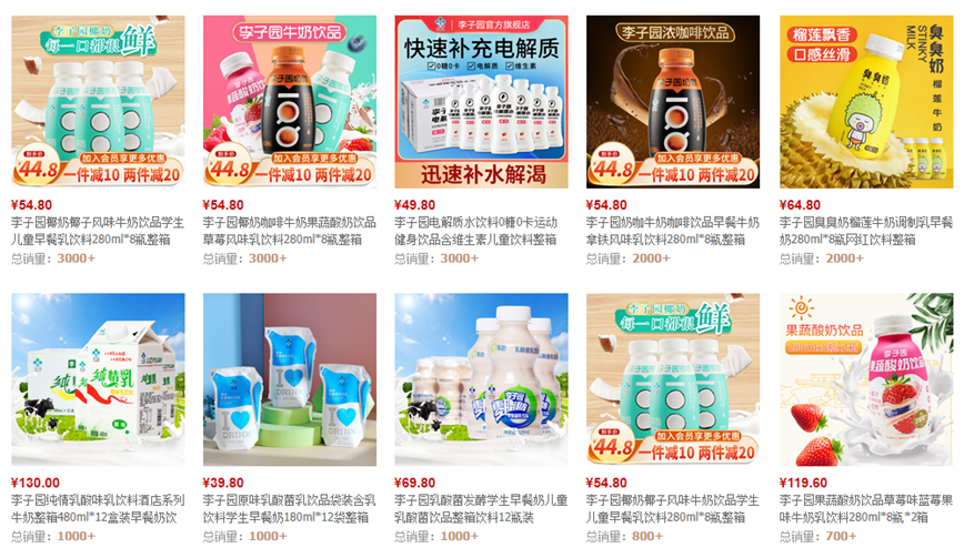《港湾商业观察》查询李子园天猫旗舰店,发现除却李子园甜牛奶系列外,其他产品销售量均未超过过万,销售量远弱于甜牛奶系列,且甜牛奶系列产品销售封面显示“买就送臭臭奶2瓶”。