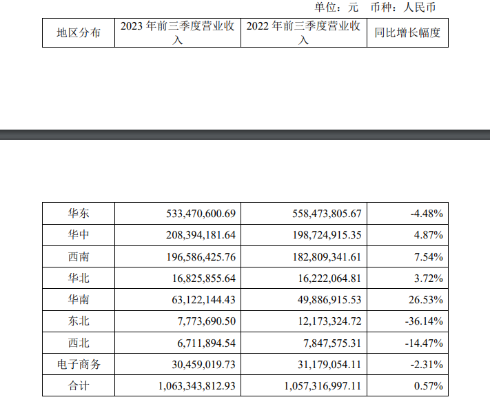 《每日经济新闻》记者查阅公司经营数据后发现,第三季度公司在“主阵地”华东地区的营业收入同比减少了4.48%。这已是今年以来,公司连续三个季度在华东地区销售同比下滑。