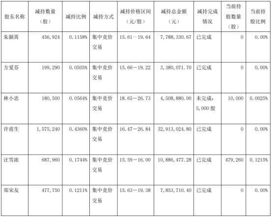 李子园(605337.SH)昨日晚间披露股东集中竞价减持股份结果公告,公司股东朱颖霄、方爱芬、林小忠、许甫生、汪雪浓、郑宋友合计减持公司357.77万股股份。