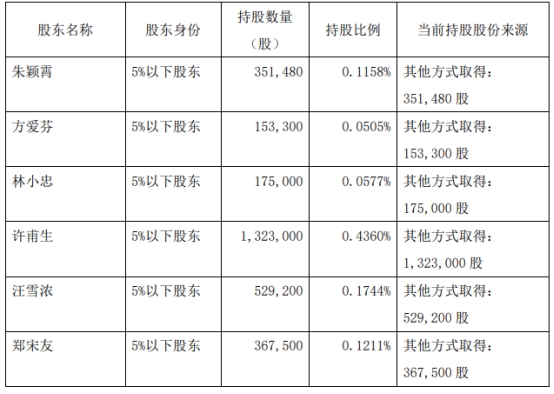 本次减持计划实施前,李子园股东朱颖霄持有公司股份351,480股,占公司总股本的0.1158%;股东方爱芬持有公司股份153,300股,占公司总股本的0.0505%;股东林小忠持有公司股份175,000股,占公司总股本的0.0577%;股东许甫生持有公司股份1,323,000股,占公司总股本的0.4360%;股东郑宋友持有公司股份367,500股,占公司总股本的0.1211%。上述股份来源于首发前限售股份及公司资本公积金转增股份。股东汪雪浓持有公司股份529,200股,占公司总股本的0.1744%,股份来源于公司原股东安吉鑫创晟瑞管理咨询合伙企业(有限合伙)解散清算,将其名下持有公司的股份以证券非交易过户的方式转让取得及公司资本公积金转增股份。