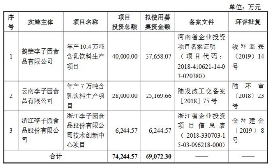 李子园上市募集资金总额77,554.80万元,募集资金净额为69,072.30万元。公司2021年1月26日披露的招股说明书显示,公司拟募集资金69,072.30万元,分别用于鹤壁李子园食品有限公司、云南李子园食品有限公司、浙江李子园食品股份有限公司。