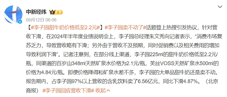 最近,在李子园(605337.SH)2024年半年度业绩说明会上,对于报告期内营收下滑,李子园总经理朱文秀解释称受经济环境影响,消费市场复苏乏力。之后,#李子园卖不动了#一度成为微博热门话题,引发了诸多网友的讨论。