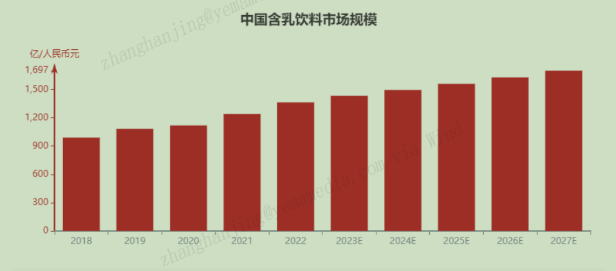 李子园业绩下滑,一方面,受含乳饮料市场增速放缓的大环境影响。“头豹研究院”数据显示,2018-2022年,中国含乳饮料市场规模的年复合增长率为8.3%;预计2027年市场规模达到1696.6亿元,年复合增长率从8.3%进一步下降到4.5%。