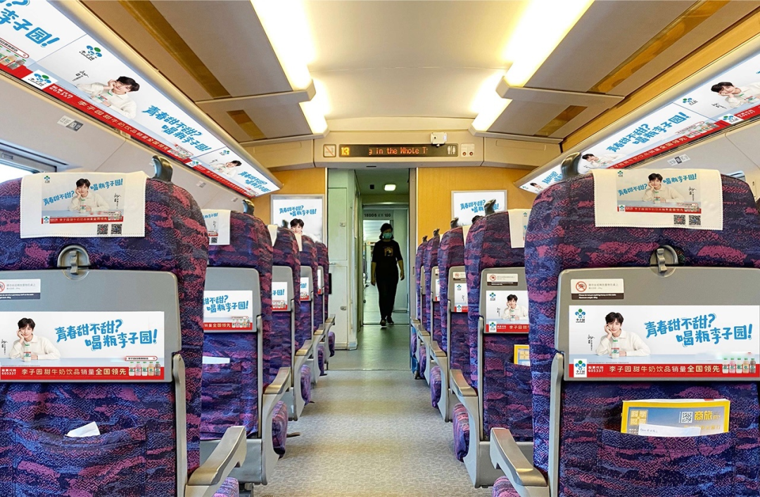 今年,李子园的横幅广告也越来越频繁地出现。4月份,李子园官宣“流量艺人”成毅为品牌代言人,一度登上微博热搜;之后还包下数十辆辆高铁广告,车身、车内全是“李子园 X 成毅”的广告。李子园或想借力粉丝经济,吸引年轻消费群体。
