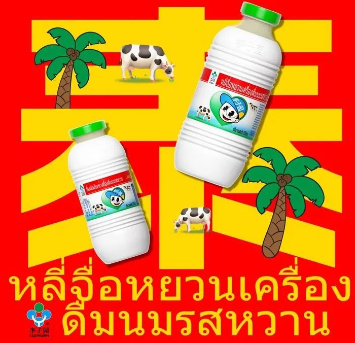 在李子园的官方微博上,还出现了配着带有泰文的甜牛奶产品海报,其中的主打产品也是李子园在国内市场经典的PET包装产品。