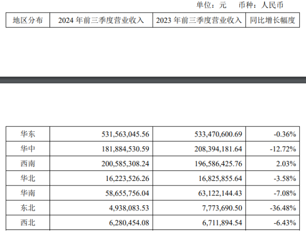 从地区分布来看,今年前三季度,李子园除了来自西南地区的收入微增2.03%之外,其余地区收入均出现下滑,其中“大本营”华东地区贡献营收5.32亿元,同比下降0.36%,华中、东北地区的收入则是双位数下滑。