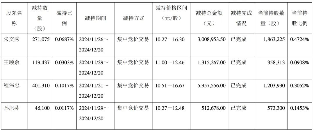 11月21日至12月20日,李子园总经理朱文秀、副总经理王顺余、董秘程伟忠、财务总监孙旭芬以及监事会主席崔宏伟通过集中竞价交易方式,分别减持约27.1万股、11.9万股、40.1万股、4.6万股、12.6万股股份,减持金额分别超300万元、131万元、595万元、51万元、134万元。
