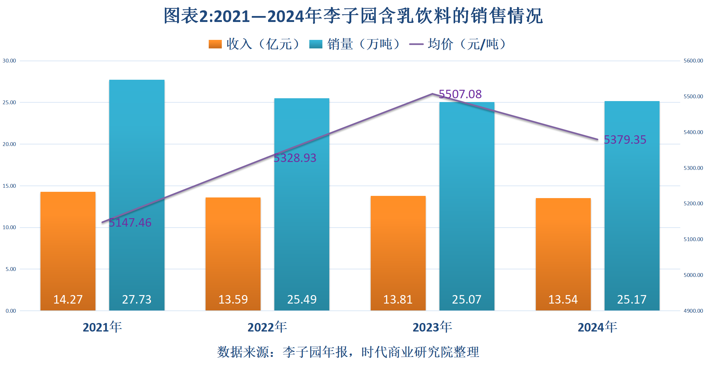 年报显示,2021—2024年,李子园含乳饮料的收入分别为14.27亿元、13.59亿元、13.81亿元、13.54亿元,销量分别为27.73万吨、25.49万吨、25.07万吨、25.17万吨。时代商业研究院由此测算,2021—2024年,李子园含乳饮料的单价分别为5147.46元/吨、5328.93元/吨、5507.08元/吨、5379.35元/吨。