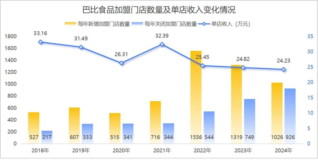2018年至2024年期间,巴比食品加盟门店的单店收入从33.16万元一路下滑至24.23万元,降幅26.93%。