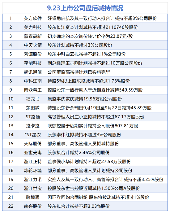 据统计,9月23日,盘后巴比食品、华凯易佰披露增持情况。包括英方软件、美力科技(维权)、蒙泰高新、中天火箭、芳源股份、孚能科技、超讯通信(维权)、福龙马、东田微、ST路通(维权)、拉卡拉、博众精工、*ST星农、天际股份、亚世光电、浙江正特、冰轮环境、浙江力诺、浙江世宝、跨境通、南兴股份、中科江南在内的22家A股上市公司披露减持情况。