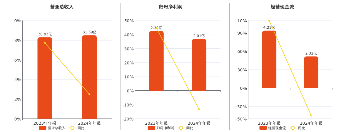公司营业总收入为31.59亿元。归母净利润为2.01亿元,较去年同报告期归母净利润减少3100.03万元,同比较去年同期下降13.34%。经营活动现金净流入为2.32亿元,较去年同报告期经营活动现金净流入减少1.89亿元,同比较去年同期下降44.93%。