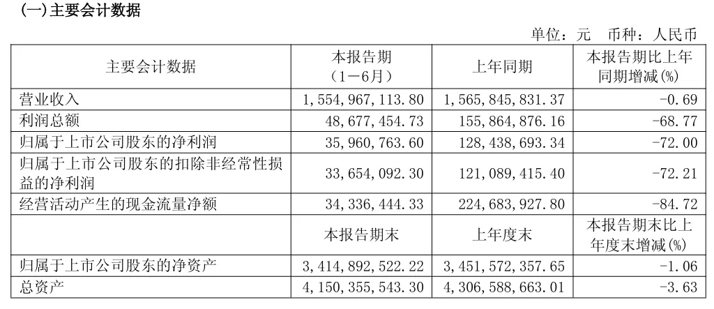 今年上半年,南侨食品的业绩呈现出断崖式下降。报告显示,公司实现营业收入15.55亿元,同比减少0.69%;实现归属于上市公司股东的净利润3596.08万元,同比减少72.00%;实现扣非净利润3365.41万元,同比减少72.21%;经营活动产生的现金流量净额3433.64万元,同比减少84.72%。