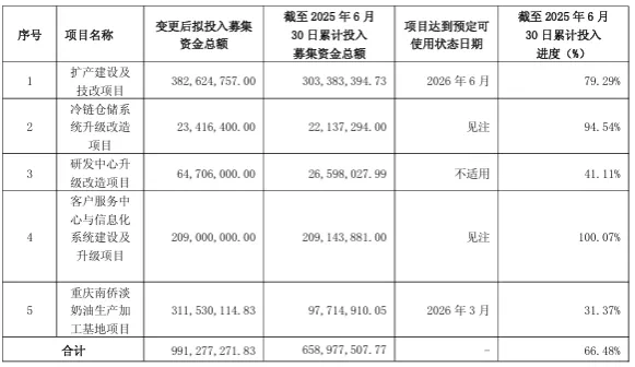 除了盈利与现金流的双重压力,备受期待的扩产建设及技改项目,也正在演变为新的风险点,项目延期与逆周期投入的矛盾愈发突出。根据最新披露,拟投入募集资金总额约3.83亿元的项目,截至2025年6月末累计投入3.03亿元,进度79.29%,原定2024年底完工的华东生产基地,已延期至2026年6月。