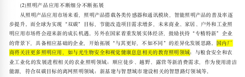 另一个细节,在本次半年报中,立达信还特别提到,未来随着智慧照明产品的普及率逐步提升,“双碳”目标深入,以及国家扶持企业向“专精特新”、差异化发展,光生物安全、教育照明、农业照明等相关领域将成为国内厂商关注的新方向。